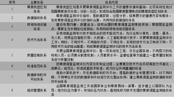 构建完善草原类型区划、数据指标、样地场地设施、技术方法、质量控制、标准规范、数据库和软件平台、组织管理等八大体系(表3)。