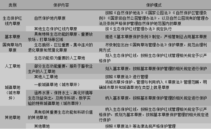 根据草原的定位、重要程度、保护利用强度不同,将全国草原划分为生态保护红线内草原、基本草原、国有草场内草原等不同空间类型,实行差别化管控措施,构建草原保护体系(表4)。加大草原生态保护建设政策支持力度,加强保护制度建设,在《草原法》的基础上,制定配套的法律法规,逐步完善草原保护管理体制。