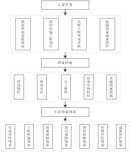 明确草原生态修复主要任务,摸清草原退化情况,组织实施工程项目,开展工程效益评估,加强修复成果管护。根据草原退化情况,采取设置草原围栏、草原改良、人工种草等生态修复措施,构建生态评价体系、工程措施体系、政策保障体系等生态修复体系(图2)。