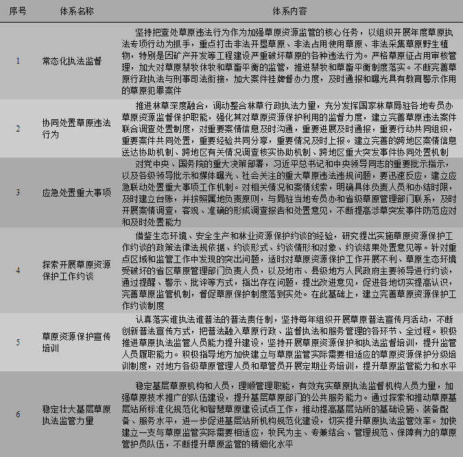 构建常态化执法监督、协同处置草原违法行为、应急处置重大事项、探索开展草原资源保护工作约谈、草原资源保护宣传培训、稳定壮大基层草原执法监管力量六大体系,提升草原执法监管能力(表6)。