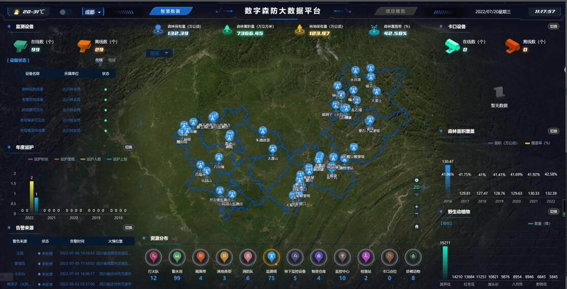 立青生物科技的森林防火预警监测系统包含风险预警体系、支撑保障体系、应急指挥体系、综合应用体系,系统通过森防“一张图”呈现森林资源、水资源、路网、天气、重点单位、危化仓库、巡护人员、防火设备、卫星热点、无人机、物种分布等多维度数据,指挥员在监控中心即可观测到火点周边的森林、人员、道路以及野生动物等分布情况。
